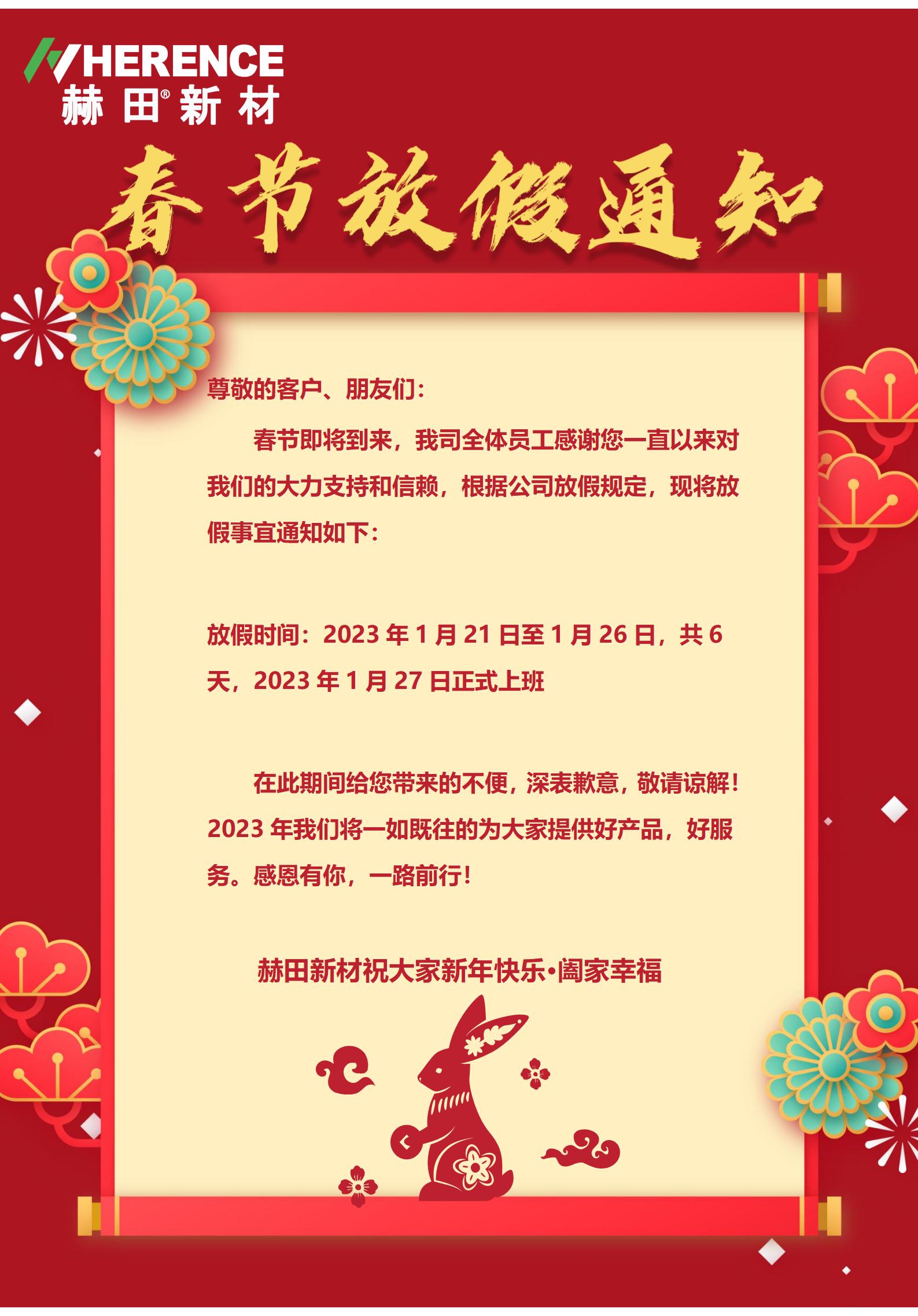 岁将更始,时乃日新,赫田新材感谢所有员工的辛勤付出,感谢各商友一直以来的理解和支持,在此向大家致以新春美好的祝福!